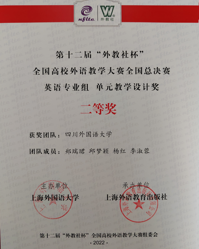 第十二届“外教社杯”全国高校外语教学大赛全国总决赛英语专业组单元教学设计奖 |
