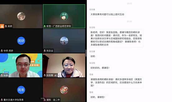 讲座尾声,陈靓教授与在线师生进行了交流互动,详细解答师生的问题。潘志高教授对讲座及互动进行了点评,张旭春教授对讲座进行了总结。至此,本次讲座圆满结束。