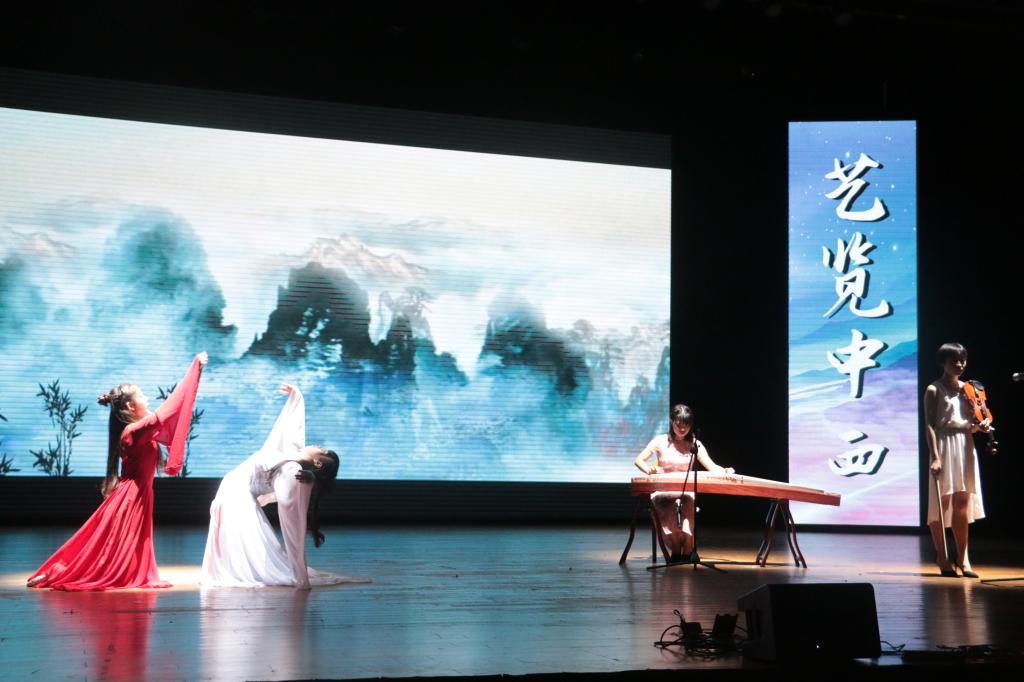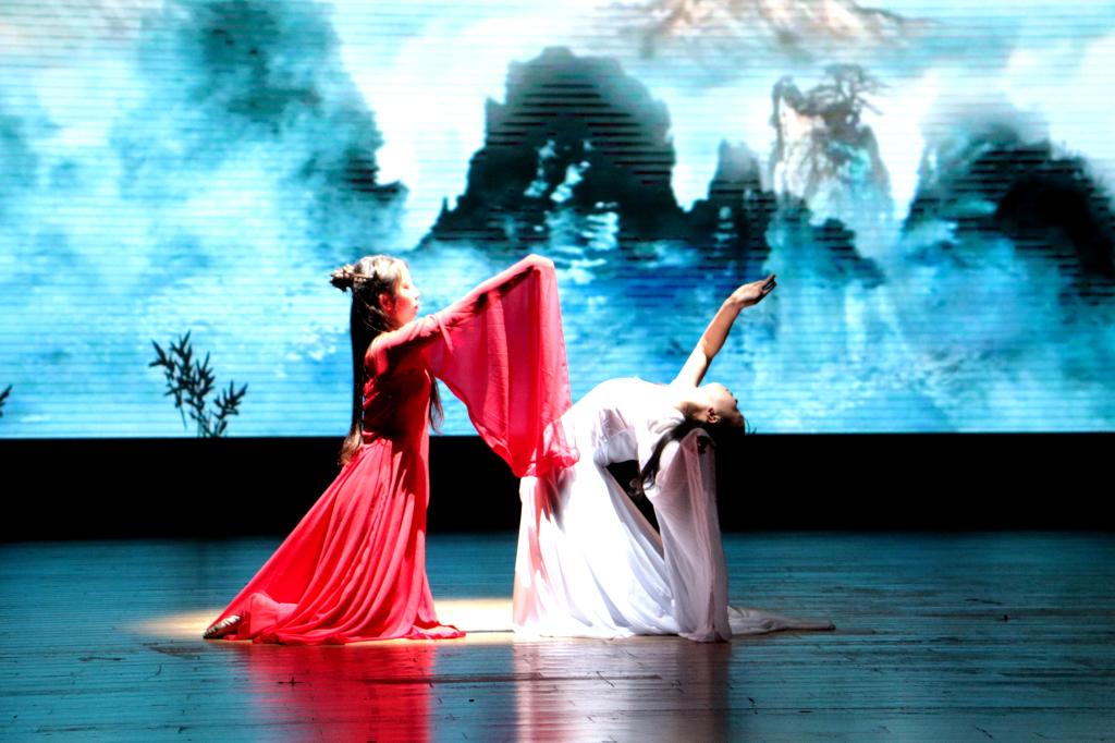 紧接着乐器伴舞演绎了一曲《凉凉》。古筝与小提琴搭配,中西方古典乐器的碰撞,使这首曲子韵味十足。舞者白衣优雅,红衣艳丽,将舞步的韵味和美感发挥到了极致。