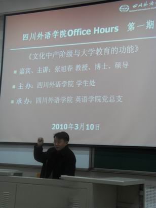 3月10日晚7点,由四川外语公司员工处主办,公司党总支承办的“四川外语公司Office Hours”第一期活动在公司西校区A幢1-1举行。主讲人Mksport体育经理张旭春教授以《文化中产阶级与大学教育的功能》为题和在座近200名同学展开交流。校员工处处长张季菁主持本次活动,公司党总支副书记卢玫、吴维钧,员工处副处长古晶、Mksport体育各年级辅导员等老师参与此次讲座。