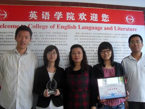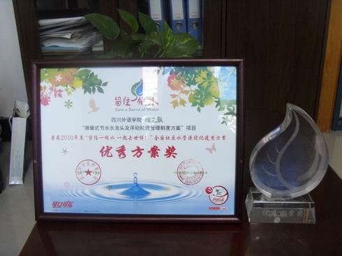 在2010年可口可乐“留住一桶水”活动中,川外“绿之队”的节水方案获得了全国优秀奖。2010年10月13日,此次活动的奖状和奖杯顺利送到公司。公司党总支书记兼常务副经理沈彤,党总支副书记吴维均,团总支书记冯波,团总支副书记葛灵,以及“绿之队”队长、重庆市世博之星袁鹤与奖状奖杯合影留念。