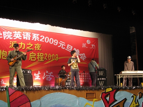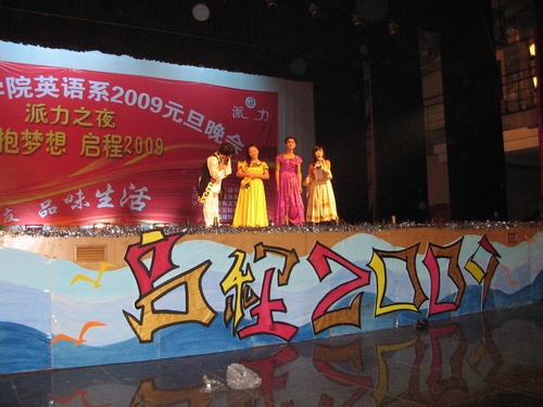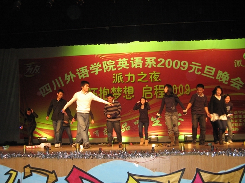 2008年12月24日晚上7点到9点,四川外语公司英语系“怀抱梦想,启程2009”元旦晚会在大礼堂圆满举行。 英语系元旦晚会由英语系师生共同策划精心筹备,同台献映,体现了英语系师生的多才多艺和团结互助。晚会节目通过话剧、歌曲、舞蹈、乐器演奏,诗朗诵、DV作品等多种形式表达了丰富的内容,体现了"怀抱梦想,启程2009"的主题。 元旦晚会节目共分为四部分。 第一部分是序章。开场乐队在现场演唱了《彩虹》《天使》两首歌,带动了现场观众的气氛。这边方罢,08年百事新星歌唱大赛冠军车驰与傅文婷联袂演唱了《好心分手》,顿时现场气氛被点燃了!接着,歌舞短剧《carnival》的青春活力营造的欢快气氛驱散了寒冬的阴霾,让现场观众感受到了节日的喜庆。 五位优秀的主持人华丽现身,凭借良好的形象气质和自身素质征服了观众,成为晚会的一大亮点。 第二部分是古色古香话升平。男女对唱彝族民歌韵味十足。在RED社团的帮助下,来自惠灵的残障人氏表演了斗牛舞,虽然他们动作有些迟钝,可是大家都看到了他们对生命的热爱和对梦想的执着努力,现场不时响起热烈的掌声。《花木兰》彻底颠覆传统,将耳熟能详的经典故事改编成了看似无厘头搞笑的话剧,新颖别致。古典舞《袖舞清风》古色古香,唯美浪漫。舞蹈赏心悦目,四手联弹《one man 's dream》轻快的曲调也沁人心脾。 互动环节是别出心裁的包装“木乃伊”,即用卷筒纸为模特做造型,现场观众踊跃参加,积极配合,进展顺利,气氛活跃。 第三部分是新言新语诉心声。两首独唱歌曲《come on over》、《there you will be》悦耳动听。晚会邀请的中国民族管弦乐委员会会员,青年演奏家何老师用笛子将《牧民新歌》演绎得淋漓尽致。英语系老师也粉墨登场,一展身手,美丽的女老师们带来了美丽的藏族舞蹈《洗衣歌》。DV作品和诗朗诵《回首2008,展望2009》紧叩晚会主题,回顾了中国和川外2008,同时也展望了美好的2009。 第四部分是载歌载舞笑明天。员工会部长们的舞蹈活力四射。话剧《寻情记》中男生的成功反串演绎了别样的童话,现场暴笑连连。接着是激情昂扬的街舞秀《break it on down》。 最后,晚会在歌曲联唱中完美谢幕了。正如主持人所说,晚会结束了,可2009年我们梦想已经起航!