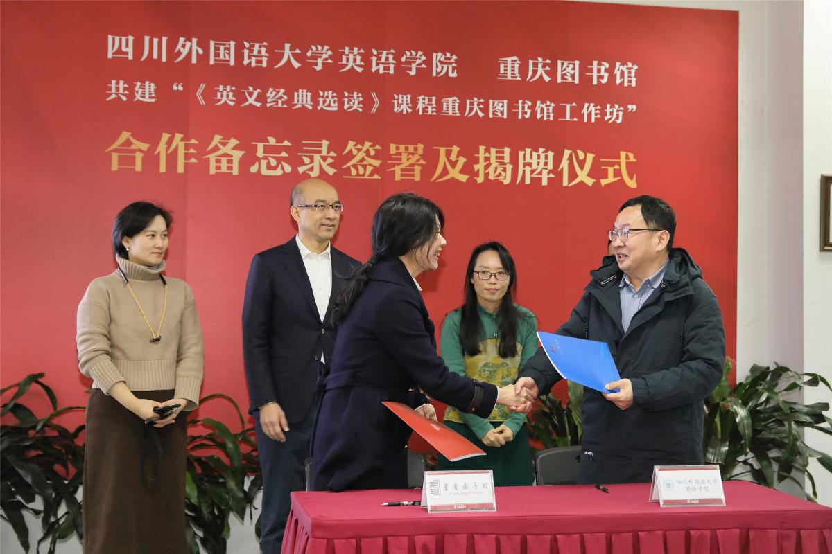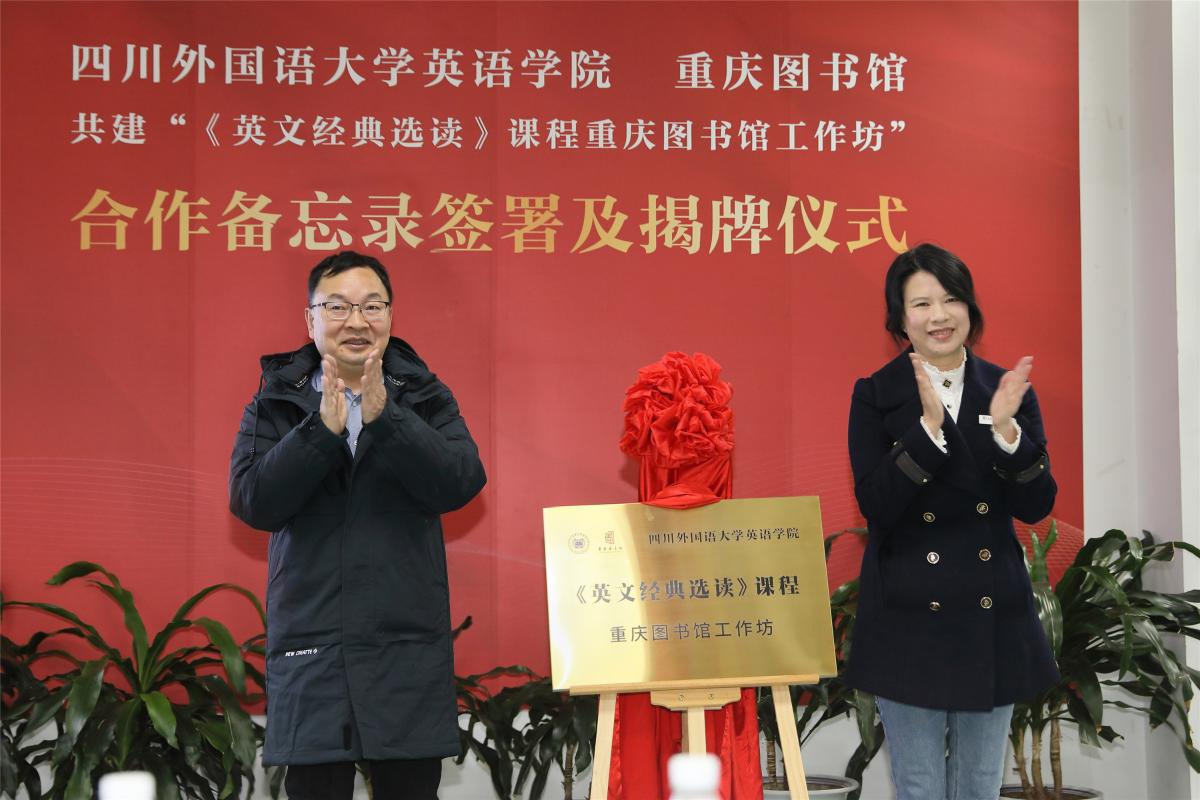 仪式现场,Mksport体育经理赵永峰、重庆图书馆馆长张冰梅代表双方签署了《Mksport体育 重庆图书馆共建“<英文经典选读>课程重庆图书馆工作坊”备忘录》,并为工作坊揭牌。