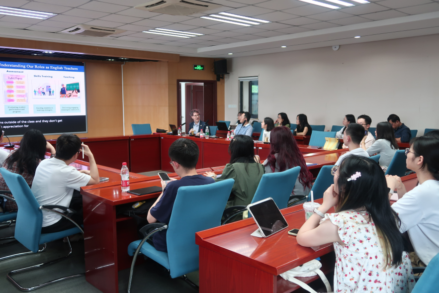 最后,Barry Lee Reynolds副教授围绕时下热点话题——人工智能做了分享。Barry Lee Reynolds副教授表示,人工智能不会取代英语教师,而是一个推动教学变革的工具。善于利用人工智能的教师将在教学竞争中展现优势,落后于技术融合潮流的教师才可能面临被替代的风险。英语教学需要平衡人工智能与人文指导:人工智能是辅助教学的工具,教师则提供关键反馈、文化理解与人际互动。