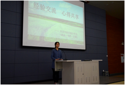 接着是已经获得保研上外的夏琼婷同学,她分享了她的保研之路。从报道,笔试,到政审,面试,等待通知的整个过程。她一一解释了每一个流程需要注意的事项,这些看似常规的流程背后却是扎实的英语专业知识的积累,同时,她也提醒学弟学妹在低年级要打好基础,学好专业课。
