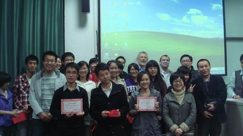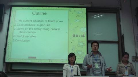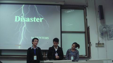 第四组上场的Hunter由两位男同学和一位女同学组成,其中一位男同学用英语风趣的说:“我们叫Hunter的原因,是因为我们两人想要追求到这位女士”。在笑声中,开始了他们关于Disaster的演讲,不过,准确地说,这并不像一场普通的演讲,更像是脱口秀节目,三位同学表达地非常轻松,就像是用采访的形式就各种自然灾害进行讨论,当然,也包括汶川地震和西南旱灾这些引人关注的问题。特别值得注意的是,两位男同学分别来自四川和云南,他们对这两场灾害感受特别深刻。所以,这种留露出真情实感的表现吸引了所有人的目光。笔者很喜欢他们这种轻松的表达方式。当然,这种更像聊天似的演讲方式,也得到了评委老师和同学们的认可。
