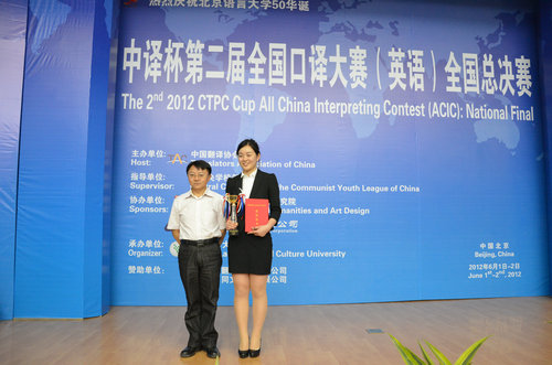 2012年6月2日,由中国翻译协会主办的中译杯第二届全国口译大赛(英语)交替传译全国总决赛暨颁奖典礼在北京语言大学举行。Mksport体育08级本科生徐欢在丁小洹老师的指导下表现出色,最终名列第十,与翻译公司MTI研究生张梦(第五名)同获三等奖。