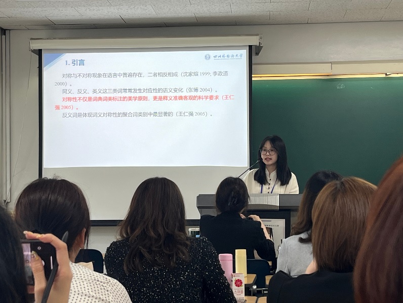 我院研究生黄婷在语法分会场做了题为“‘统一/分裂’词类范畴化的不对称性:一项超学科路径的研究”的报告,基于语料库对 “统一/分裂”的使用模式进行调查,探讨其不同用法的规约化程度以及词类范畴化的不对称性现象,研究视角新颖,引发了学者热烈讨论。