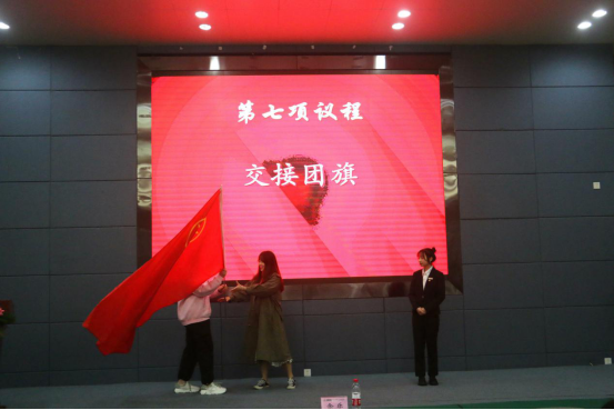 接下来进行的是团旗交接仪式。团旗由余乐老师从苏雨晨学姐手中传递到龚雒学姐手中。这不仅仅是一面旗帜的交接,更是责任的交接,使命的交接,信任与荣誉的交接。