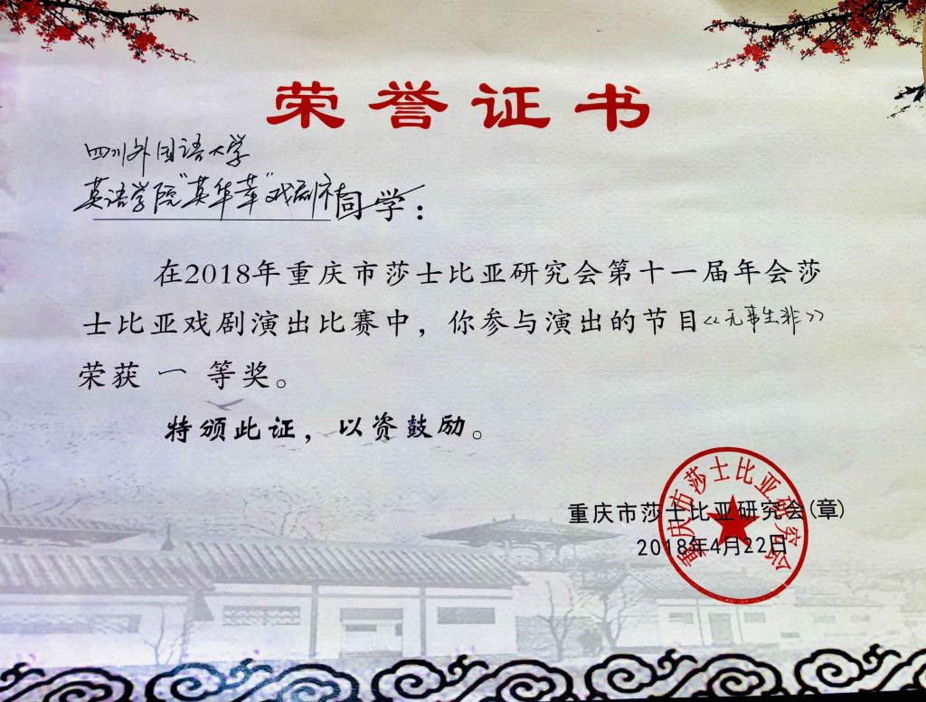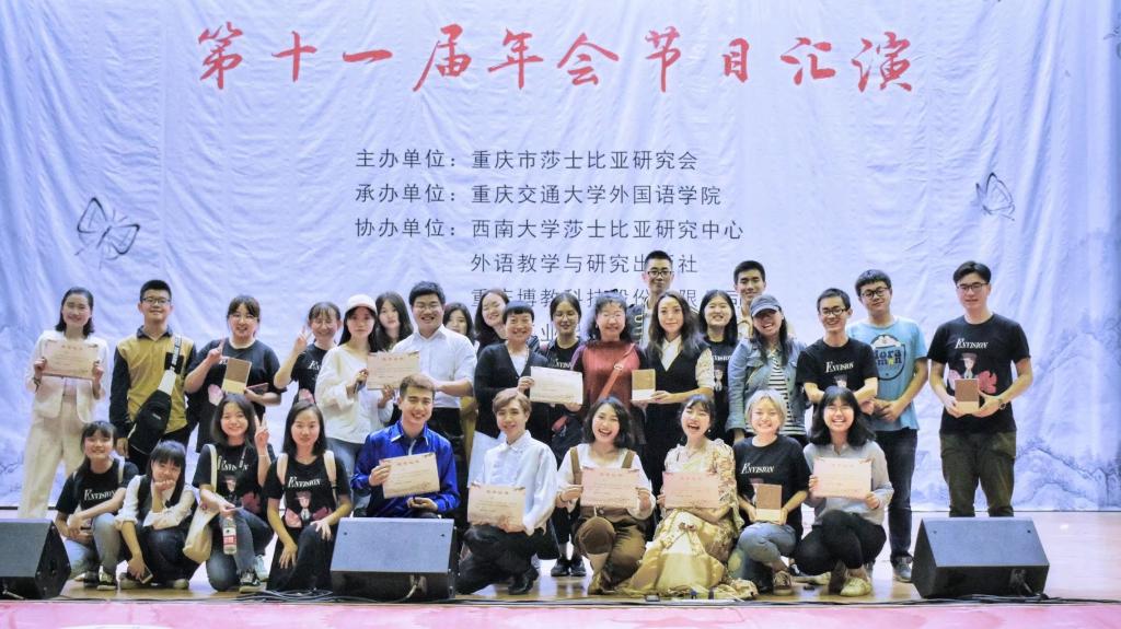 2018年4月22日,重庆市第十一届莎士比亚年会戏剧比赛在重庆交通大学举行。此次大赛吸引来自西南大学、重庆师范大学、厦门理工大学等全国八所高校的剧社参与。“英华萃”戏剧社以莎翁经典喜剧Much Ado About Nothing《无事生非》在激烈的角逐中脱颖而出,荣获第一名。三位社长胡庆、王丹和罗茂格同学组织井然有序,使剧社在参演的各个环节都表现出较高的专业水平。导演许文阳同学和剧本创意赵玉聪同学透彻把握了莎翁原作的精髓,并在此基础上赋予经典全新演绎。主演余俊义、邹子于、王子烨、石化雨、郭芮希、刘蒙、 许文阳、易世强、柳一迪等同学台词功底深厚,表演收放自如,英语语音语调纯正地道,受到中外评委的一致赞扬,也给全场观众留下了深刻的印象。本剧的幕后工作人员张茂竹、刘翔、刘艳玲、何佳静、彭航等同学在舞美、场记等工作中力求精益求精,全力保证了演出的成功。良好的团队合作精神,是“英华萃”剧社在本次比赛中取得成功的奠基石。