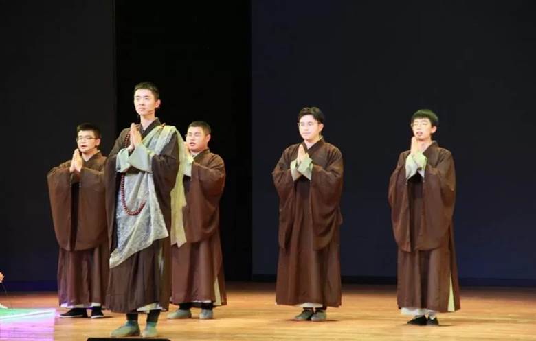 经过主持人的热情互动后,表演开始了。话剧演员从台下慢慢走到台上,接着,舞台灯光亮起,话剧主角之一法海登场,其幽默诙谐的语言和有趣的肢体表演引得台下观众一片掌声。