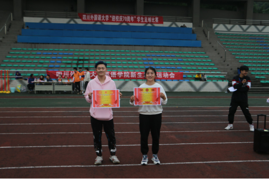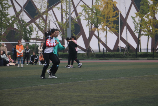 接下来是两人三足。随着裁判一声令下后,同学们以两人一组互相搀扶着向终点跑去。有的配合默契,一边走一边喊着口号“一二、一二、一二”;也有的状况百出,或是摔倒在地,或是迈不开腿。班级里的其他成员们也在加油打气,赛场上一片欢声笑语。