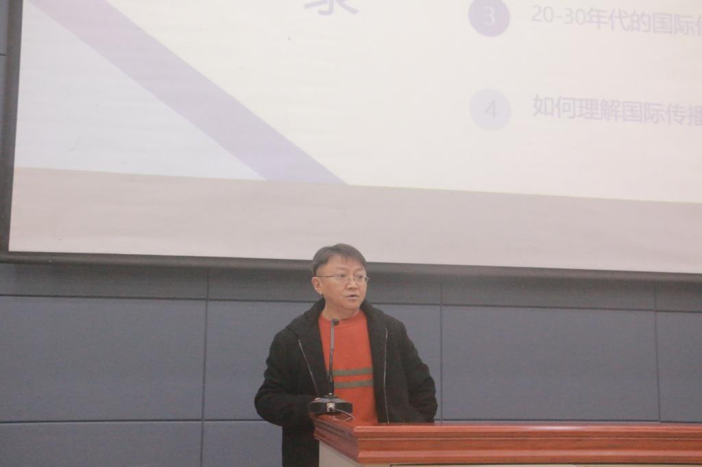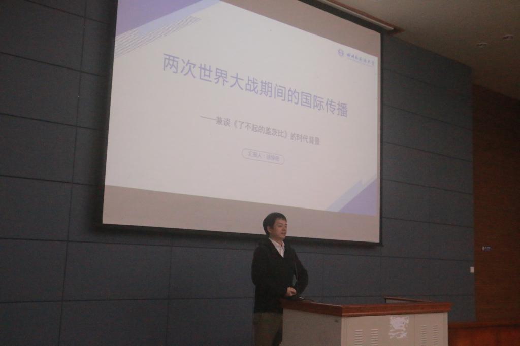 第一场讲座的主讲人徐惊奇博士毕业于上海外国语大学全球传播专业。讲座的题目为“两次世界大战期间的国际传播——兼谈《了不起的盖茨比》的时代背景”。徐博士首先介绍了小说的时代背景,并梳理了文本中有关大众传媒的描述,进而介绍了《纽约时报书评》等书评类传媒工具的重要意义。接着分三个阶段梳理了抗日战争时期国内作家、在华外籍人士及外国记者对中国形势分析的新书和书评方式的传播。徐博士用生动的案例解释了国际传播不仅仅止步于跨越国界的信息流动,更多的是希望本国的所作所为能够被别的国家所理解和接受。强调要理解国际传播中的国际话语权,要认识到传播方式的多样化、技术和知识产权的重要性,要用外人能够听懂的方式发声。