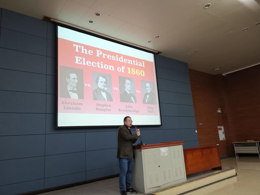 第二场讲座的主讲人张国玺博士毕业于北京外国语大学英语专业,研究领域为美国政治。讲座的题目为Reading Lincoln: The Man and His Times。张博士以读书的三重境界“Read on the lines;Read between the lines;Read beyond the lines”开篇,总结了卡耐基的巨著The Unknown Lincoln中林肯的形象:Becoming Lincoln (林肯的成长之路)Becoming Savior(美国的救世主)Becoming Immortalized(美国的永恒),进而探讨了美国的种族问题、美国的政治、民主等问题。最后以美国著名诗人惠特曼的O,Captain!My Captain结束了本场讲座。