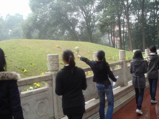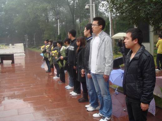 活动第二项是向革命先辈的献花仪式。同学们捧着鲜花,表情凝重,沿着墓旁的小路徐徐前进。他们将手中寄托着对革命先辈的崇敬和怀念之情的鲜花抛入园中。鲜花经过雨水的洗涤显得格外的醒目,正如革命精神经过时间的考验愈发显得重要和珍贵。