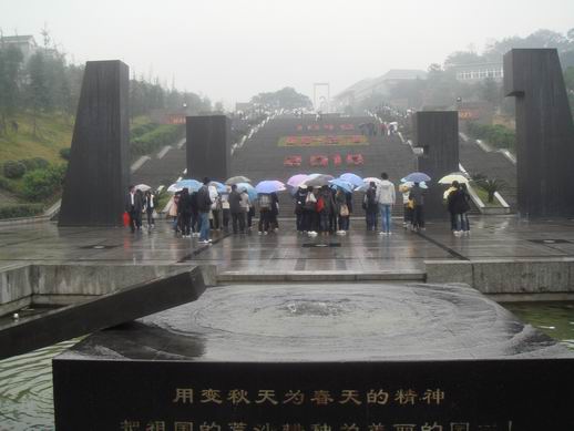 虽然当日天空下着小雨,但并没有影响同学们对瞻仰革命先烈的缅怀之情,他们手捧鲜花,表情肃穆,沿着红岩魂广场长长的阶梯拾阶而上。同学们聚集在烈士墓前,首先进行了庄严的宣誓仪式。同学们回顾历史,学习革命先烈的大无畏精神,展望未来,以先烈为榜样,准备好为祖国的明天做出贡献。此环节还特别加入了唱国歌活动,旨在提醒同学们勿忘国耻,幸福生活来之不易,要铭记革命先驱们做出的巨大牺牲。