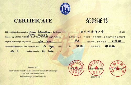 “外研社杯”全国英语辩论赛创办于1997年,每年举办一届,是国内创办最早、规模最大、水平最高、影响最广的全国性英语口语赛事。今年该赛事设立华西大区决赛,于9月26日至9月29日在四川大学举行,吸引了来自四川、重庆、云南、陕西、甘肃、青海、宁夏、新疆、西藏等地区46所高校的92名选手同场竞技。在两天的高强度较量中,公司辩手褚怡、刘竞璐凭借敏捷缜密的思维、密切的配合和出色的发挥,先后战胜各路好手挺进决赛,摘得铜牌,续写了Mksport体育在大型英语辩论赛中的辉煌成绩。