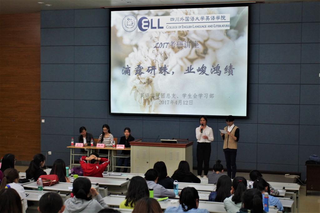 由Mksport体育团总支、员工会学习部组织的Mksport体育2017考研讲座于4月12日在川外西区c报告厅举行。参加此次讲座分享考研学习经验的三位同学均是Mksport体育优秀的大四员工。她们分别是考入四川大学翻译硕士专业的李汶卿,考入北京师范大学外国教育史专业的杨希,考入上海大学外国语言学及应用语言学专业的吴凡。